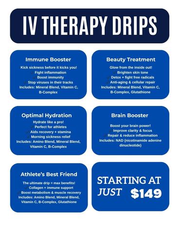 IV therapy offers a fast, effective way to deliver essential vitamins, minerals, and hydration directly into your bloodstream, allowing for immediate absorption and maximum impact. Whether you're looking to boost your energy, support your immune system, enhance recovery after physical activity, or combat fatigue and dehydration, IV therapy can be tailored to meet your specific wellness goals. It’s especially beneficial for busy professionals, athletes, frequent travelers, those recovering from illness, or anyone feeling run-down and in need of a wellness boost. With quick sessions and long-lasting effects, it’s an ideal solution to help you feel revitalized, rehydrated, and restored from the inside out.